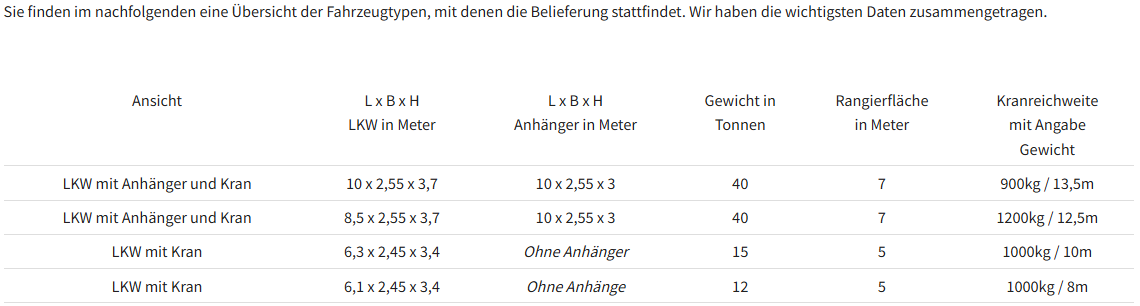 Damit unsere Fahrer die Ware sicher anliefern können, achten Sie bitte auf einen tragfähigen Untergrund und eine freie Zufahrt für schwere LKW.